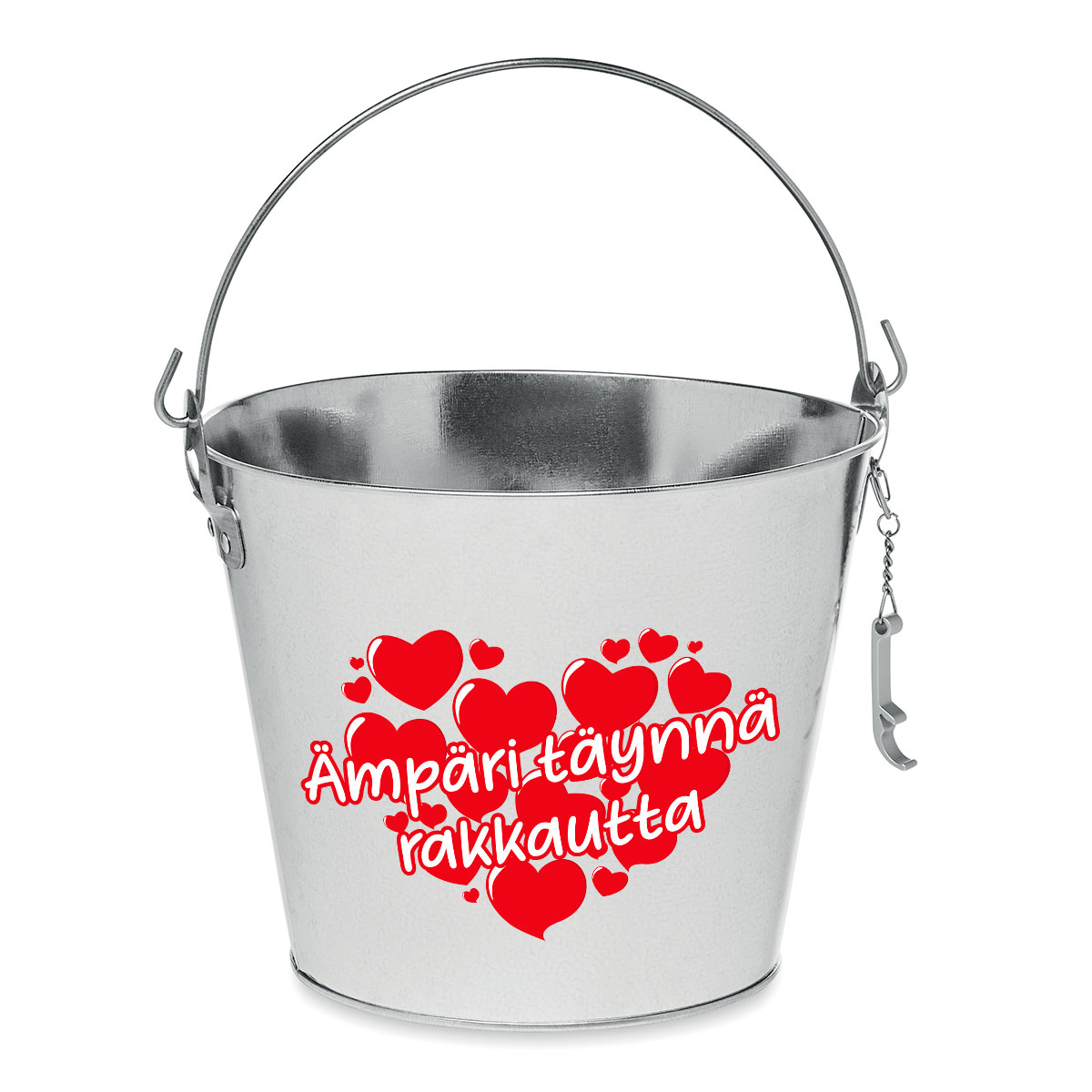 Ämpäri myydään tyhjänä, joten voit täyttää sen haluamallasi tavalla – juomilla, makeisilla, suklaalla, söpöillä rihkamakoruilla, pienillä lahjoilla tai jopa rakkaudentäyteisillä viesteillä. Se on loistava tapa luoda henkilökohtainen, lämmin ja ainutlaatuinen lahja.