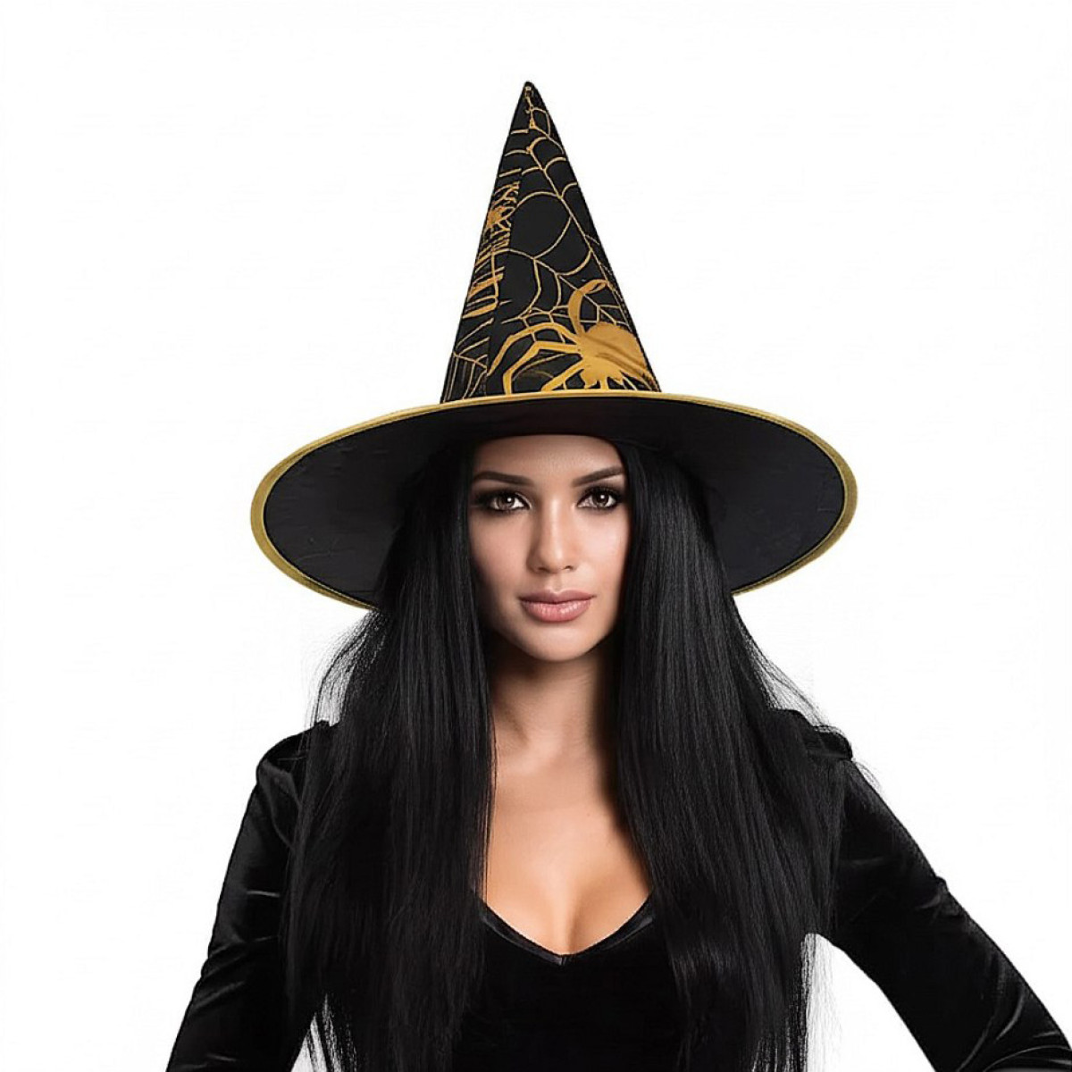 Noitahattu on välttämätön asuste Halloweeniin, karnevaaleihin tai teemajuhliin. Mustaa, teräväkärkistä hattua koristavat kultaiset hämähäkinseitit ja hämähäkki, mikä antaa kokonaisuudelle ainutlaatuisen ja mystisen tunnelman.