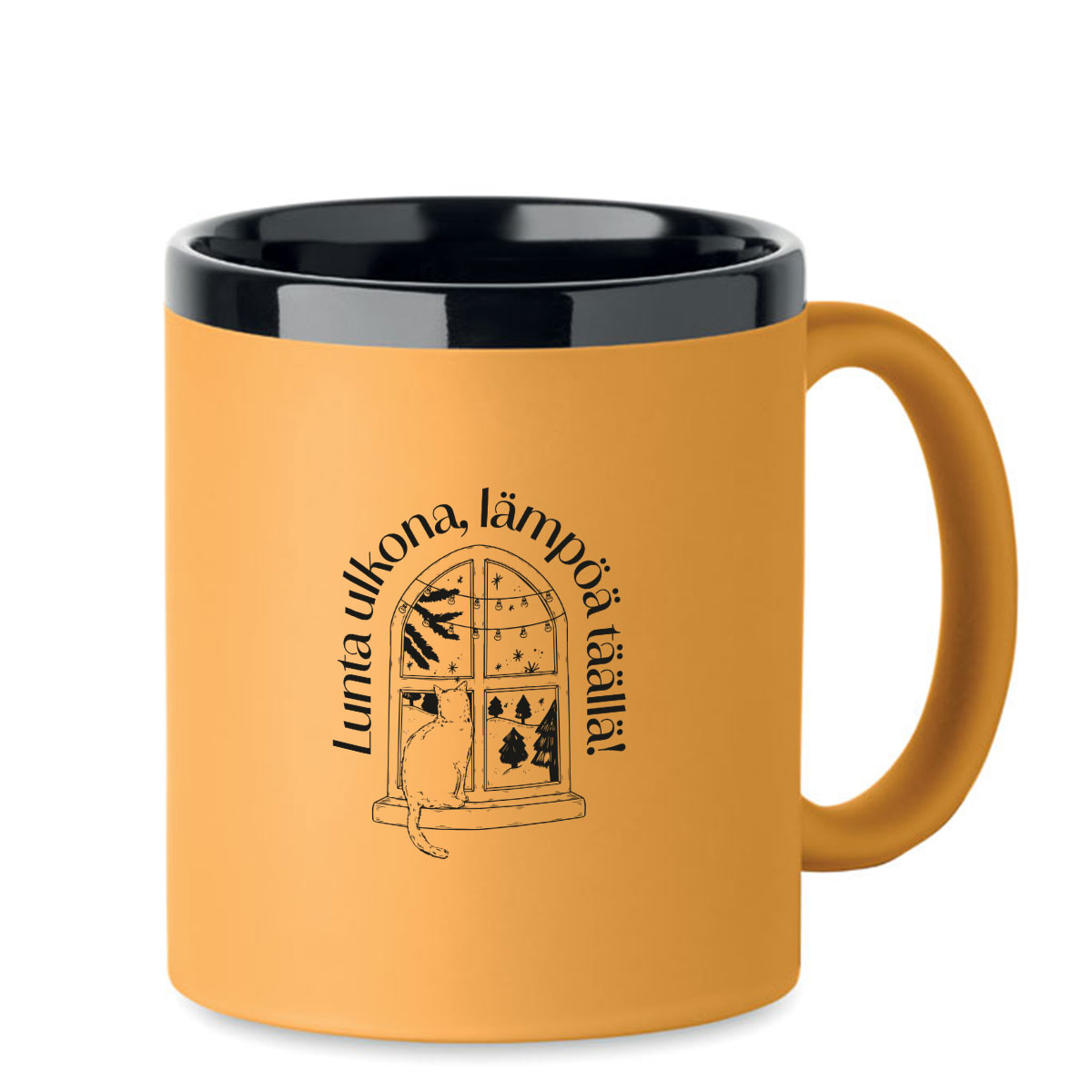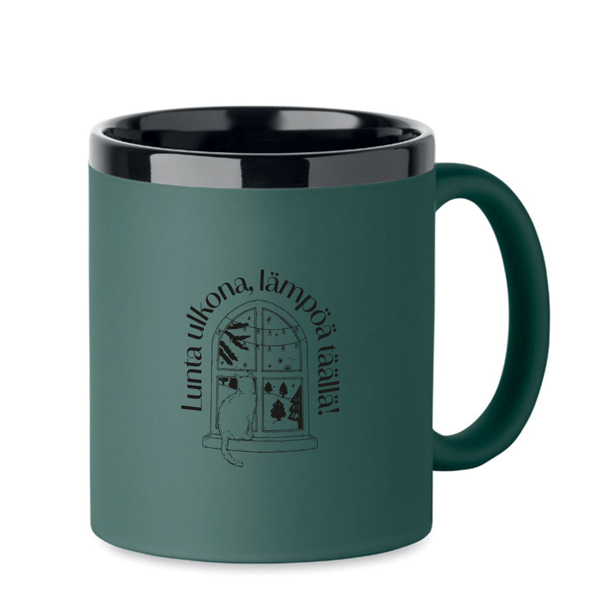 Kaiverrettu muki "Lunta ulkona, lämpöä täällä"