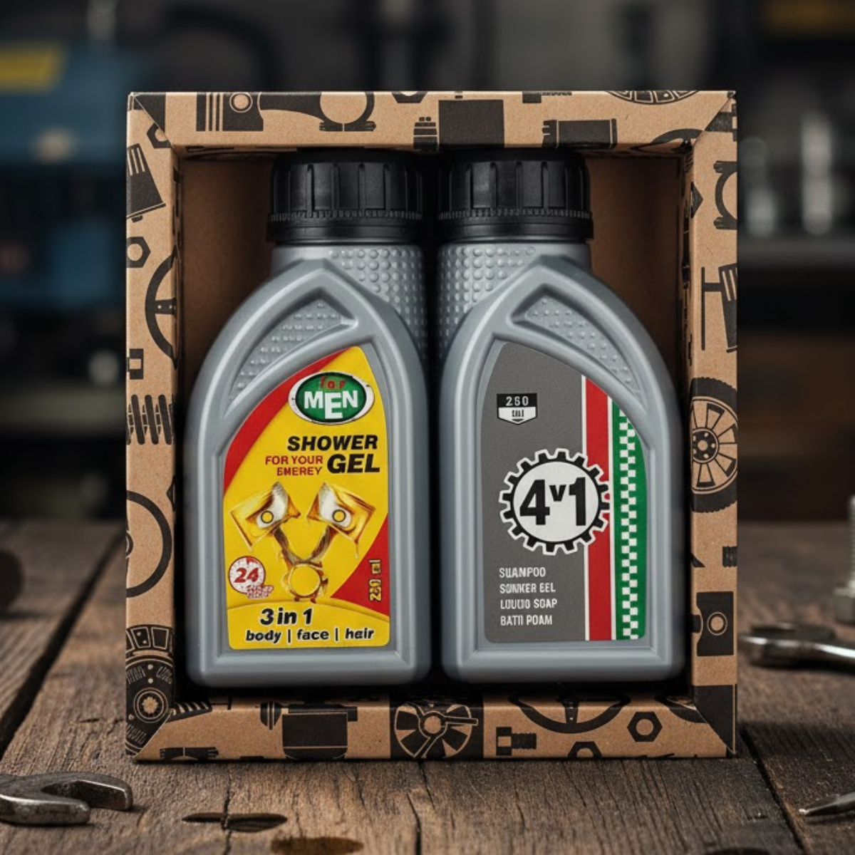 Suihkugeeli ja shampoopakkaukset näyttävät autoöljypulloilta, joten tämä setti on täydellinen miehille, jotka pitävät vartalostaan huolta ja arvostavat hauskoja ja käytännöllisiä lahjoja.