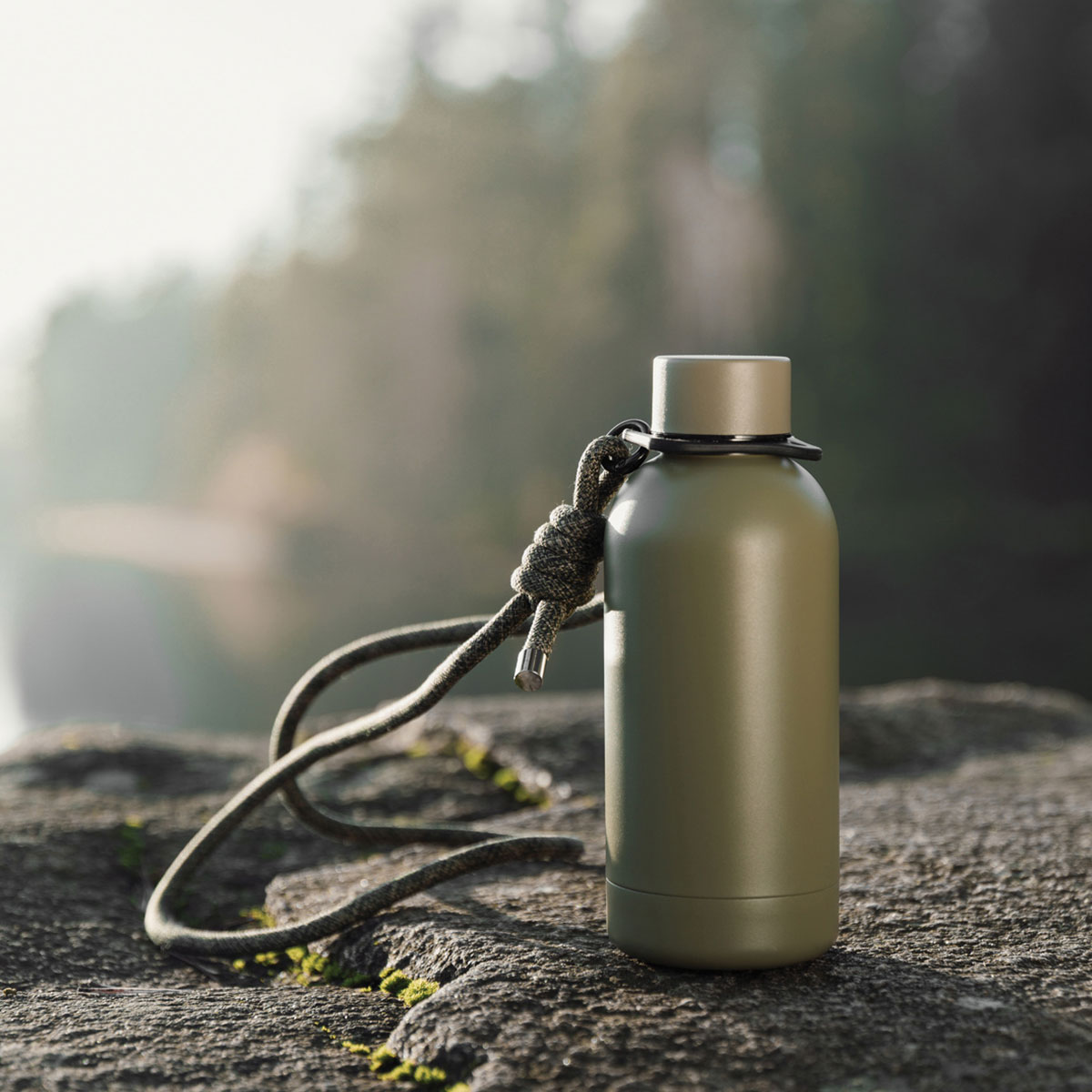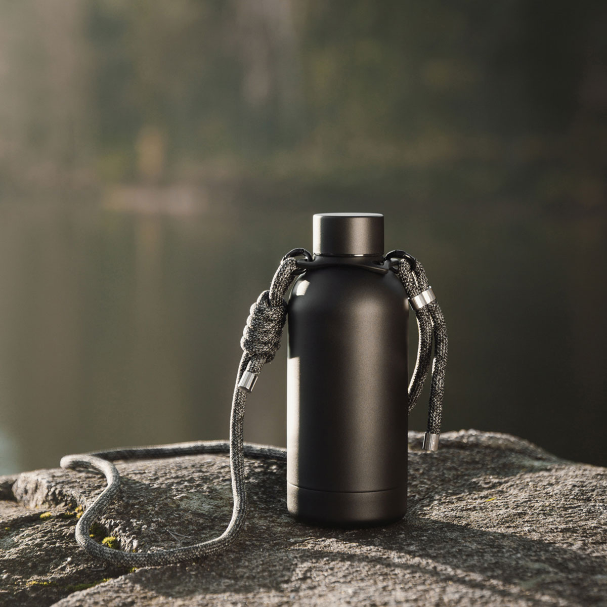 Valmistettu korkealaatuisesta kierrätetystä ruostumattomasta teräksestä (70 % kierrätettyä terästä, 30 % ruostumatonta terästä), tämä pullo on paitsi kestävä myös ympäristöystävällinen.