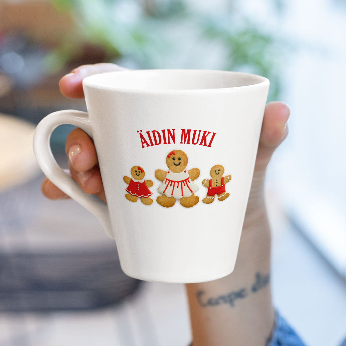 Kirjoitus on sijoitettu mukin molemmille puolille, joten se näkyy sekä sinulle että kaikille ympärillä oleville.