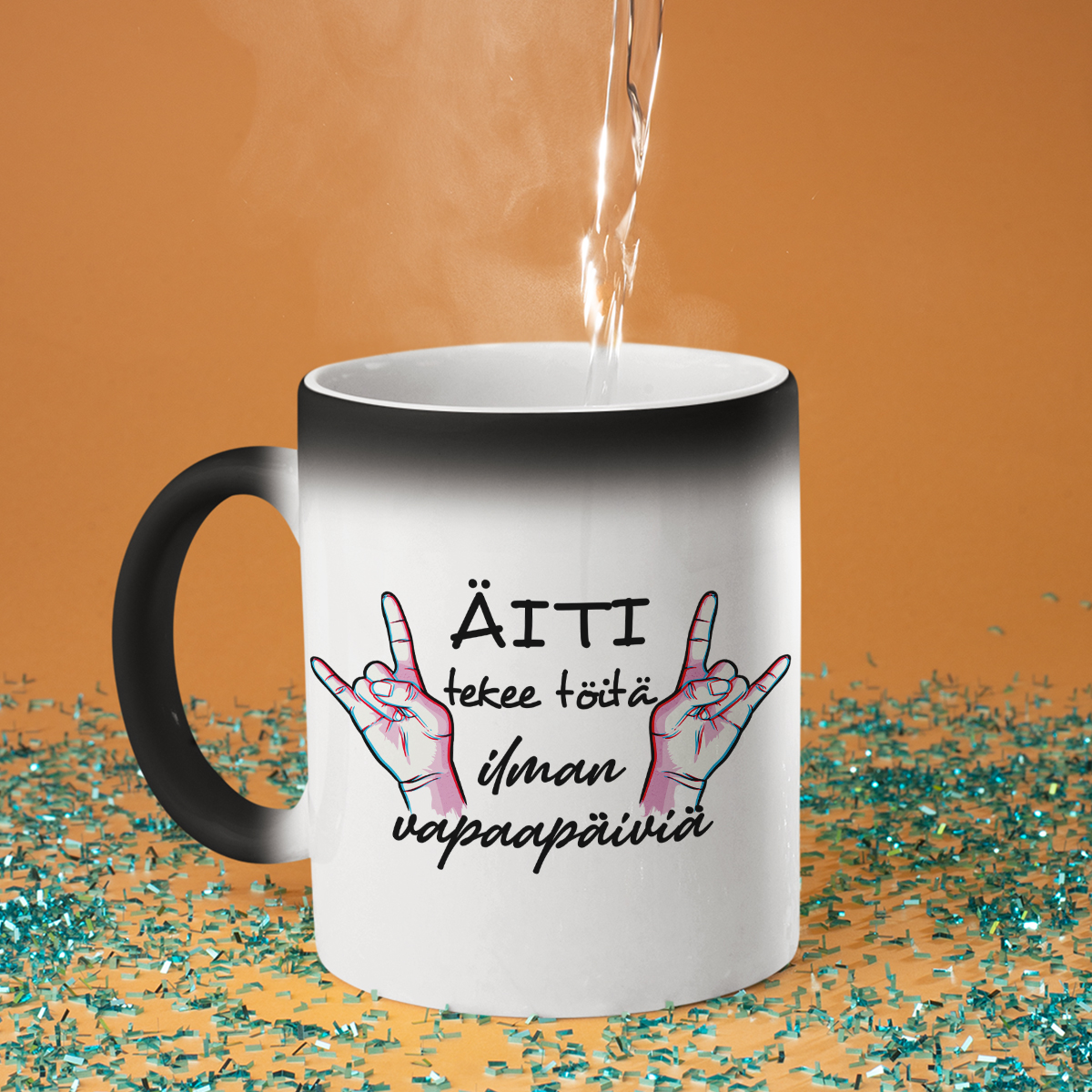 - Taikamuki – ei turhaan kutsuttu taikamukiksi! Ensi silmäyksellä se on yksinkertainen musta muki, mutta kun kuumaa vettä kaadetaan, se muuttuu valkoiseksi ja piilotettu painatus paljastuu. Se on todellinen yllätys ja pieni ihme jokaiseen päivään!