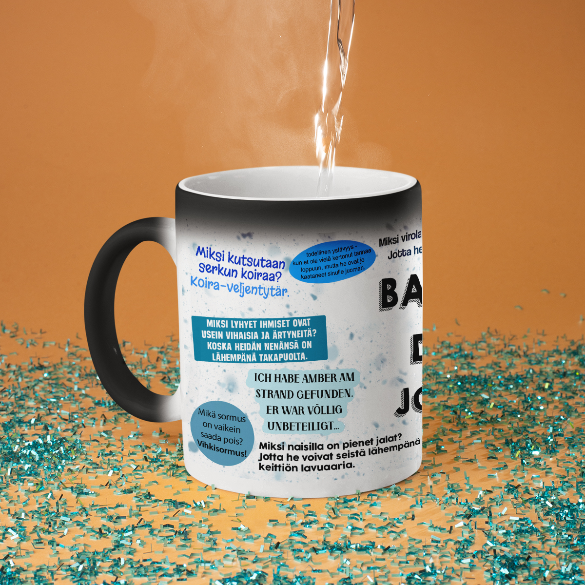 - Taikamuki – ei turhaan kutsuttu taikamukiksi! Ensi silmäyksellä se on yksinkertainen musta muki, mutta kun kuumaa vettä kaadetaan, se muuttuu valkoiseksi ja piilotettu painatus paljastuu. Se on todellinen yllätys ja pieni ihme jokaiseen päivään!