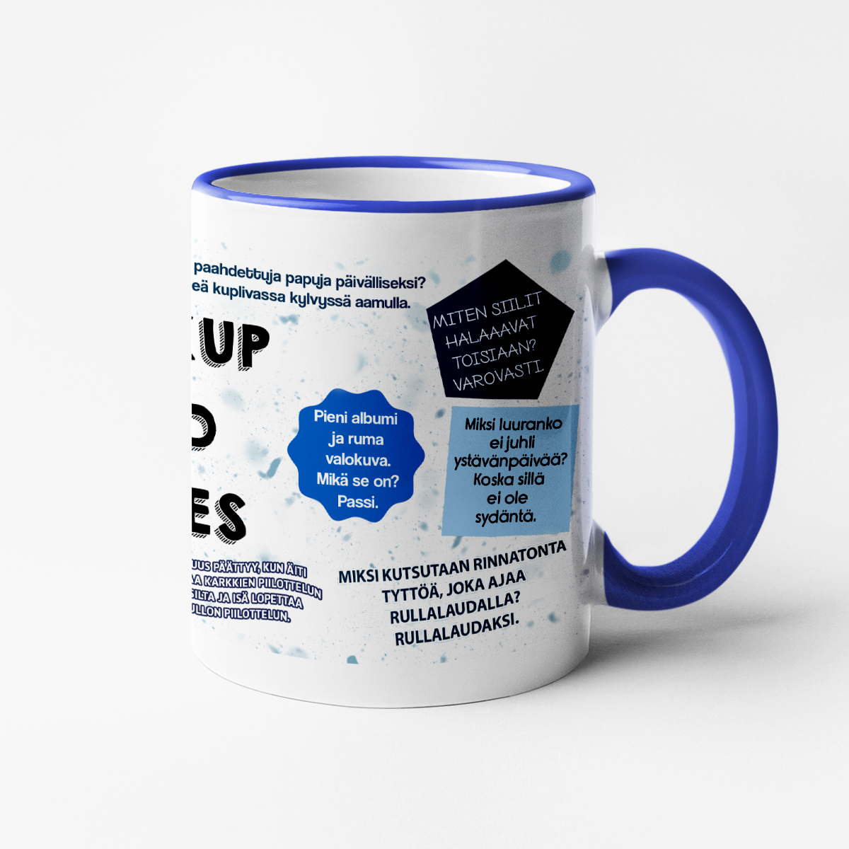 Kirjoitus on sijoitettu mukin molemmille puolille, joten se näkyy sekä sinulle että kaikille ympärillä oleville.