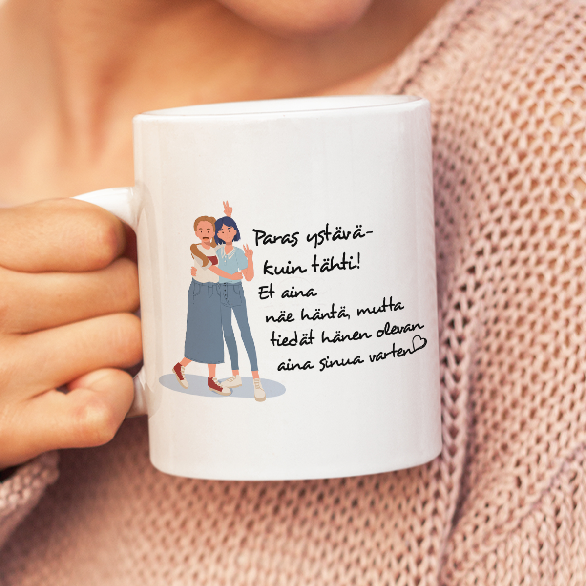 Kirjoitus on sijoitettu mukin molemmille puolille, joten se näkyy sekä sinulle että kaikille ympärillä oleville.