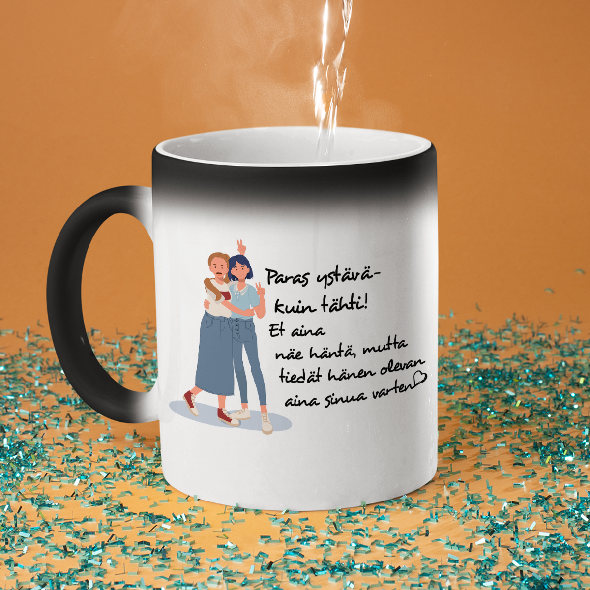 - Taikamuki – ei turhaan kutsuttu taikamukiksi! Ensi silmäyksellä se on yksinkertainen musta muki, mutta kun kuumaa vettä kaadetaan, se muuttuu valkoiseksi ja piilotettu painatus paljastuu. Se on todellinen yllätys ja pieni ihme jokaiseen päivään!