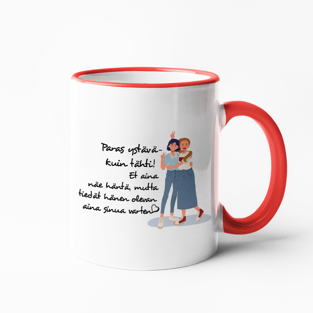 - Muki värillisellä reunalla – tämä malli erottuu tyylikkäällä muotoilullaan: hienovaraisesti värillinen reunus ja kahva, jotka antavat mukille leikkisyyttä ja korostavat täydellisesti ainutlaatuista tekstiä.