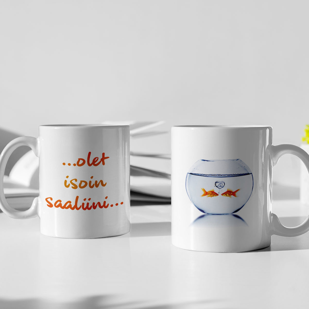 Kirjoitus on sijoitettu mukin molemmille puolille, joten se näkyy sekä sinulle että kaikille ympärillä oleville.