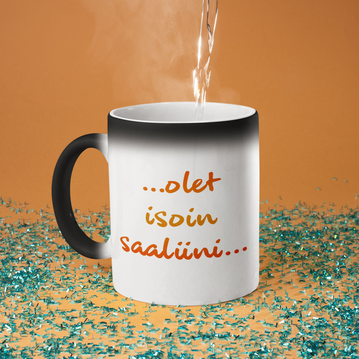 - Taikamuki – ei turhaan kutsuttu taikamukiksi! Ensi silmäyksellä se on yksinkertainen musta muki, mutta kun kuumaa vettä kaadetaan, se muuttuu valkoiseksi ja piilotettu painatus paljastuu. Se on todellinen yllätys ja pieni ihme jokaiseen päivään!