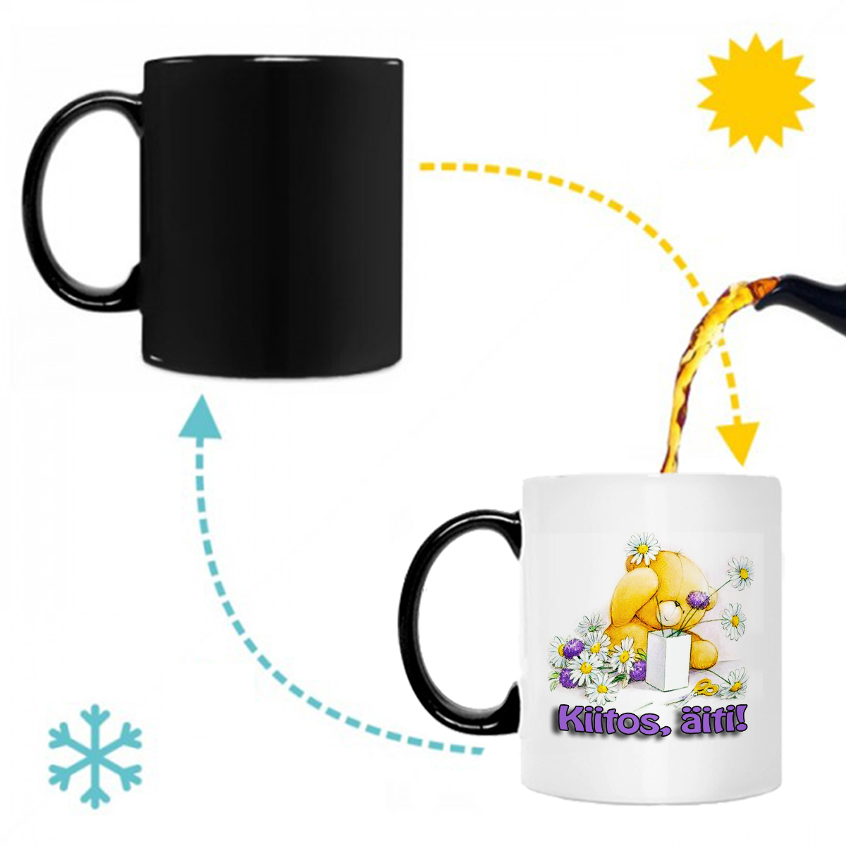 - Taikamuki – ei turhaan kutsuttu taikamukiksi! Ensi silmäyksellä se on yksinkertainen musta muki, mutta kun kuumaa vettä kaadetaan, se muuttuu valkoiseksi ja piilotettu painatus paljastuu. Se on todellinen yllätys ja pieni ihme jokaiseen päivään!