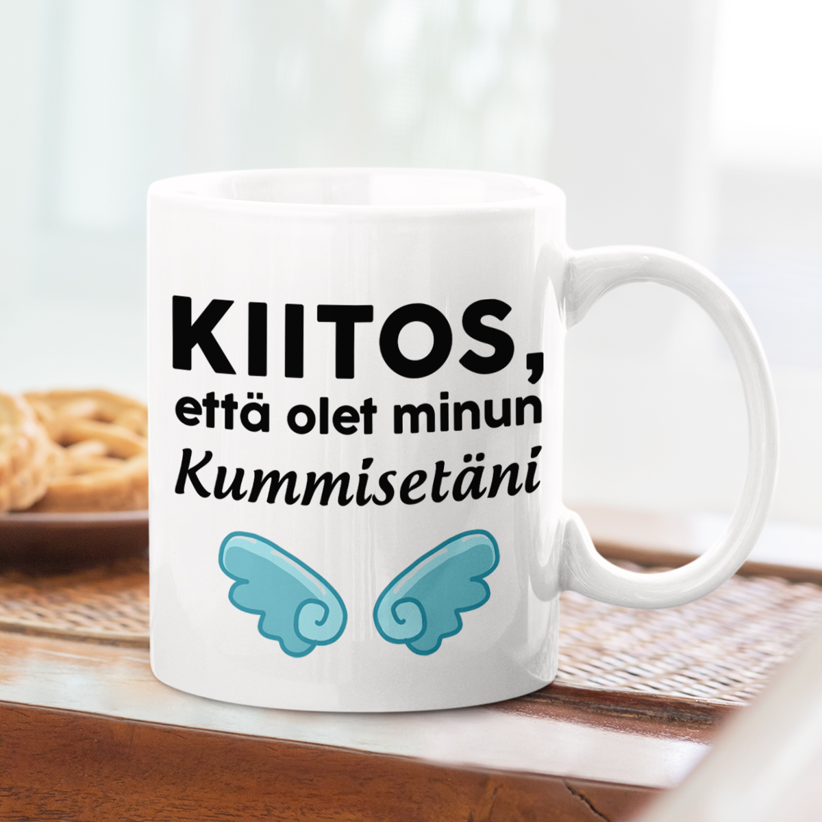Kirjoitus on sijoitettu mukin molemmille puolille, joten se näkyy sekä sinulle että kaikille ympärillä oleville.