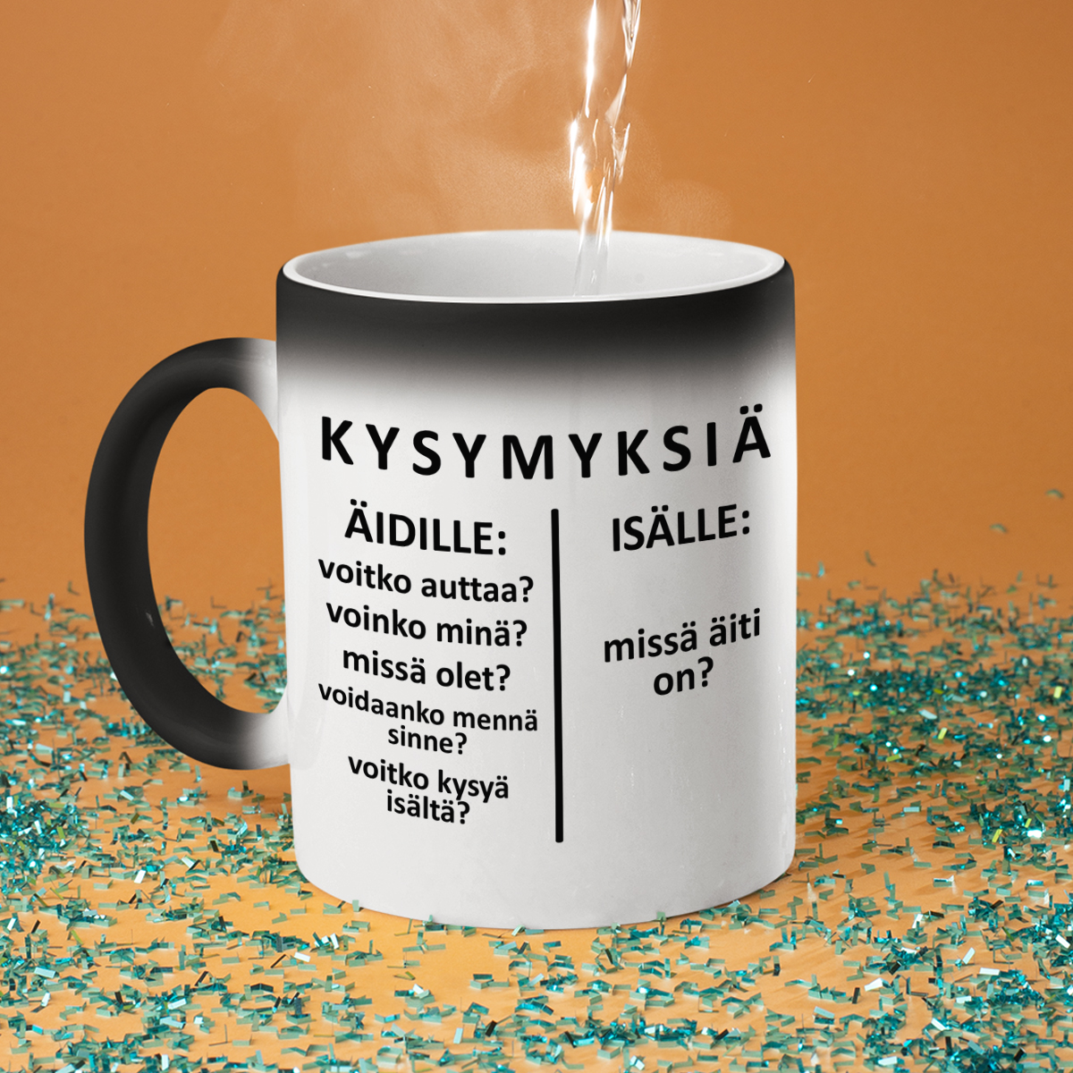 - Taikamuki – ei turhaan kutsuttu taikamukiksi! Ensi silmäyksellä se on yksinkertainen musta muki, mutta kun kuumaa vettä kaadetaan, se muuttuu valkoiseksi ja piilotettu painatus paljastuu. Se on todellinen yllätys ja pieni ihme jokaiseen päivään!