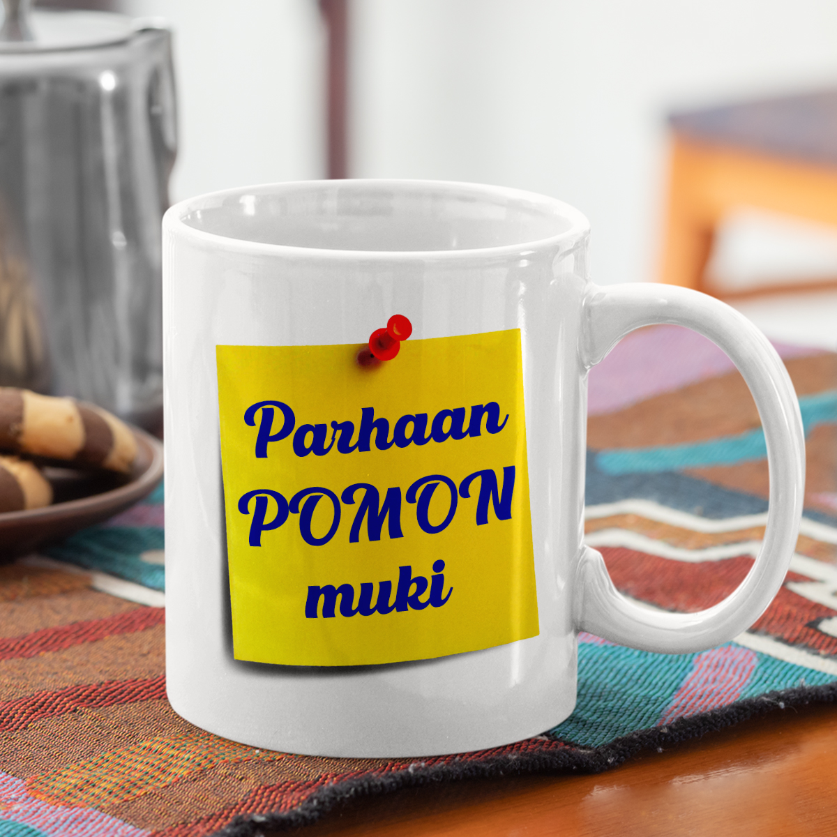 Kirjoitus on sijoitettu mukin molemmille puolille, joten se näkyy sekä sinulle että kaikille ympärillä oleville.