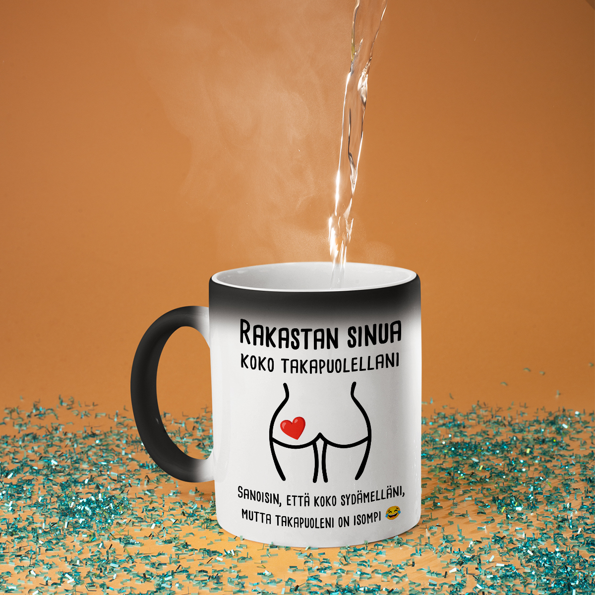 - Taikamuki – ei turhaan kutsuttu taikamukiksi! Ensi silmäyksellä se on yksinkertainen musta muki, mutta kun kuumaa vettä kaadetaan, se muuttuu valkoiseksi ja piilotettu painatus paljastuu. Se on todellinen yllätys ja pieni ihme jokaiseen päivään!