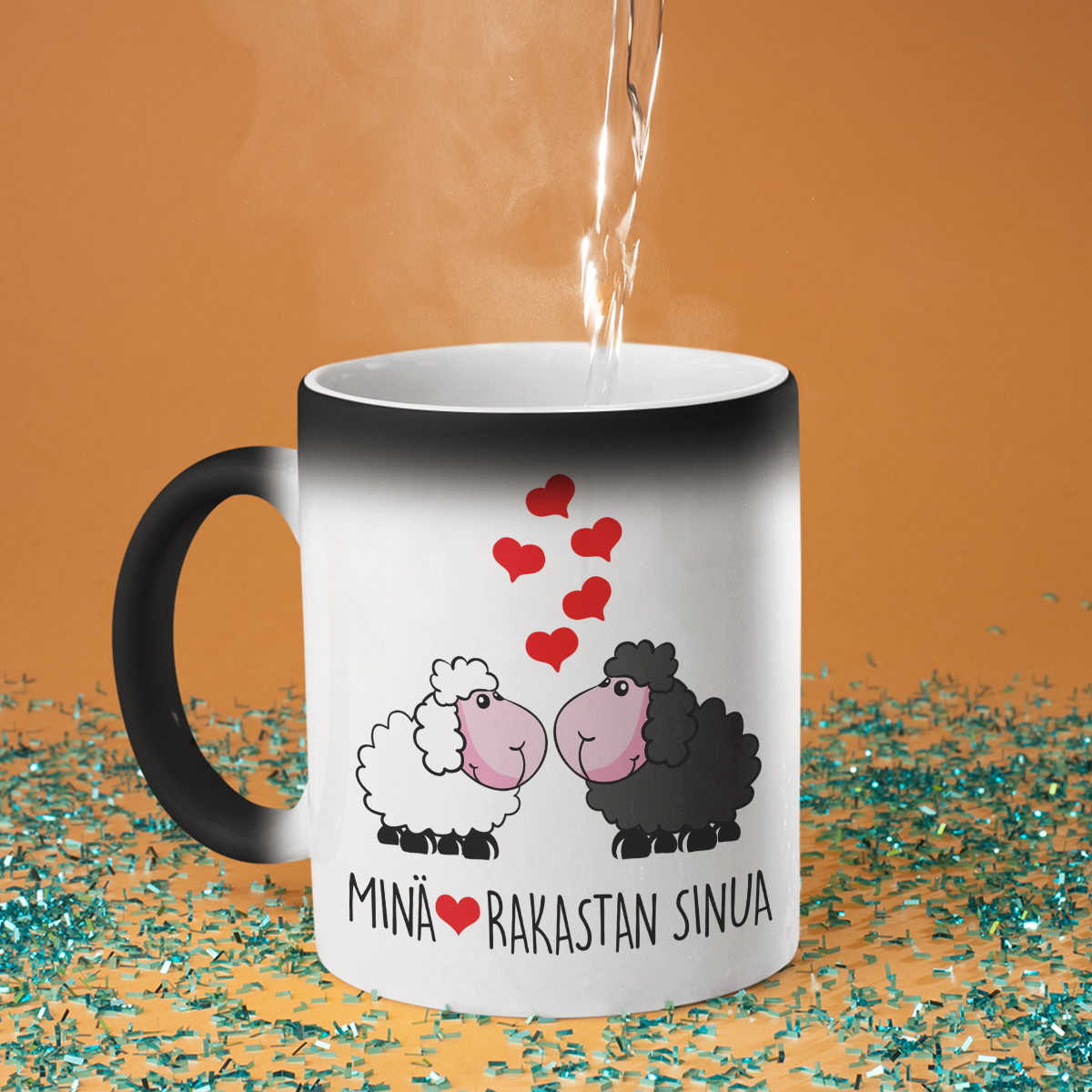 - Taikamuki – ei turhaan kutsuttu taikamukiksi! Ensi silmäyksellä se on yksinkertainen musta muki, mutta kun kuumaa vettä kaadetaan, se muuttuu valkoiseksi ja piilotettu painatus paljastuu. Se on todellinen yllätys ja pieni ihme jokaiseen päivään!