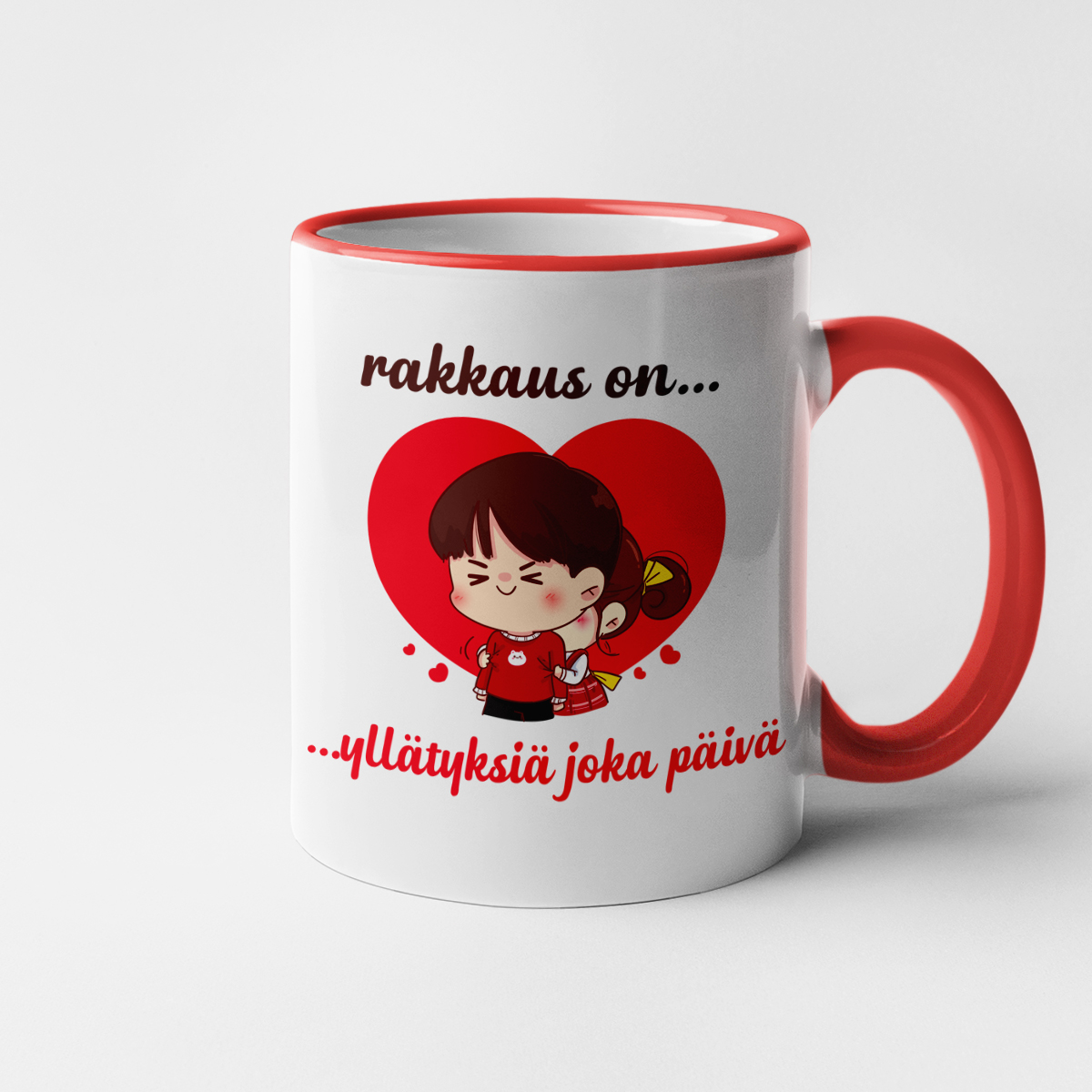 - Muki värillisellä reunalla – tämä malli erottuu tyylikkäällä muotoilullaan: hienovaraisesti värillinen reunus ja kahva, jotka antavat mukille leikkisyyttä ja korostavat täydellisesti ainutlaatuista tekstiä.