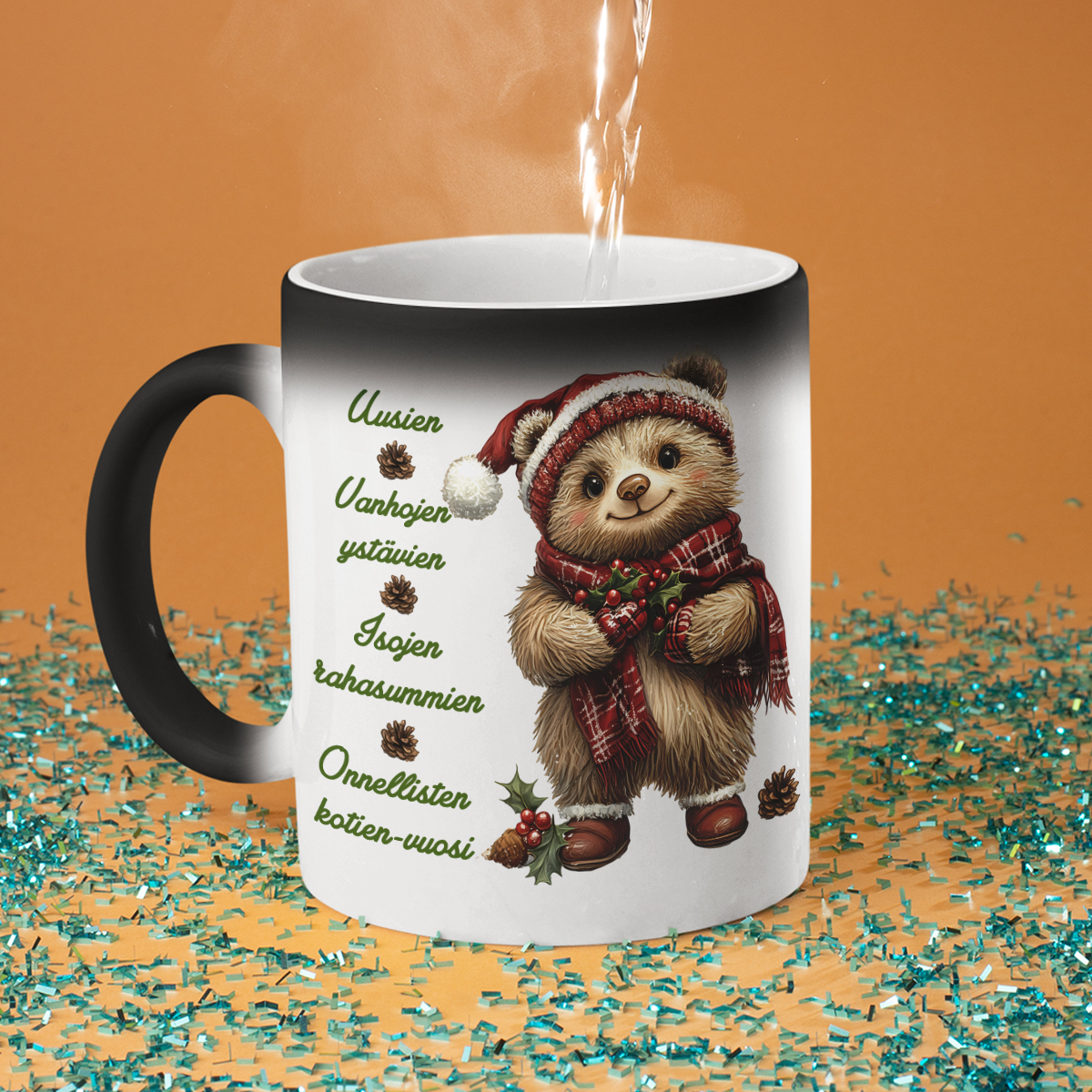 - Taikamuki – ei turhaan kutsuttu taikamukiksi! Ensi silmäyksellä se on yksinkertainen musta muki, mutta kun kuumaa vettä kaadetaan, se muuttuu valkoiseksi ja piilotettu painatus paljastuu. Se on todellinen yllätys ja pieni ihme jokaiseen päivään!