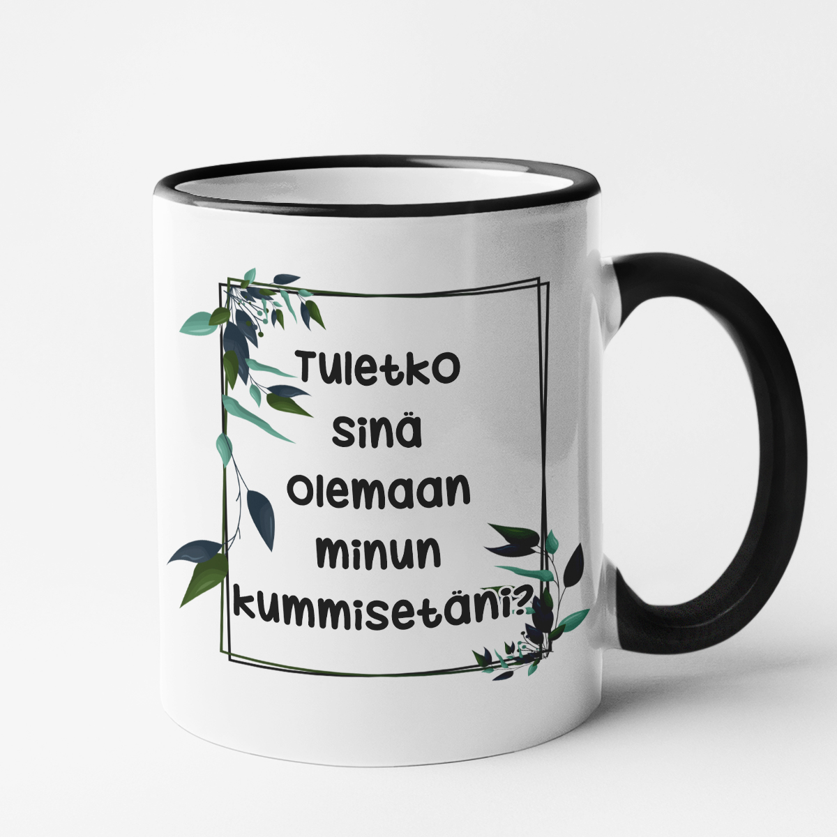 - Muki värillisellä reunalla – tämä malli erottuu tyylikkäällä muotoilullaan: hienovaraisesti värillinen reunus ja kahva, jotka antavat mukille leikkisyyttä ja korostavat täydellisesti ainutlaatuista tekstiä.