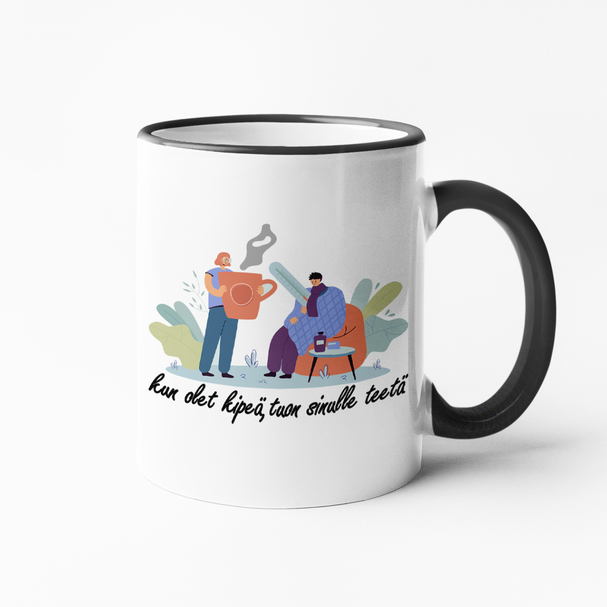 - Muki värillisellä reunalla – tämä malli erottuu tyylikkäällä muotoilullaan: hienovaraisesti värillinen reunus ja kahva, jotka antavat mukille leikkisyyttä ja korostavat täydellisesti ainutlaatuista tekstiä.