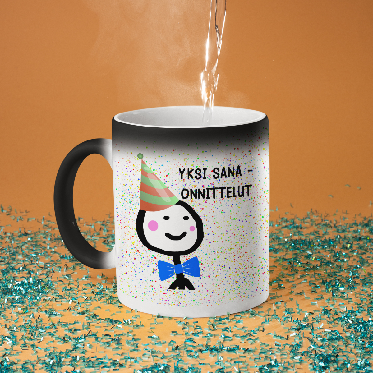 - Taikamuki – ei turhaan kutsuttu taikamukiksi! Ensi silmäyksellä se on yksinkertainen musta muki, mutta kun kuumaa vettä kaadetaan, se muuttuu valkoiseksi ja piilotettu painatus paljastuu. Se on todellinen yllätys ja pieni ihme jokaiseen päivään!