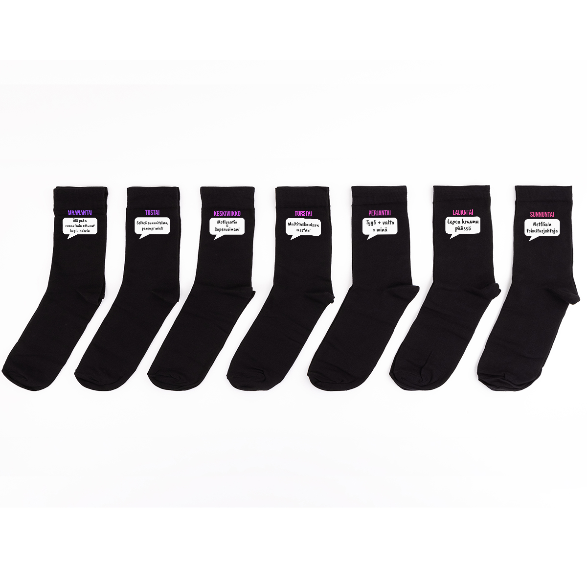 - 7 paria sukkia, joissa jokaisessa sukassa on painatus (7 eri asettelua x 2 kpl).