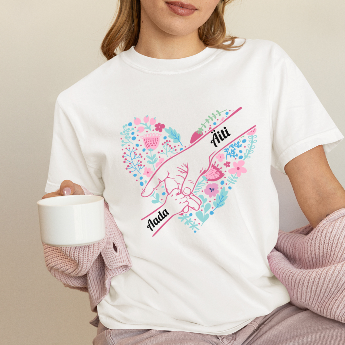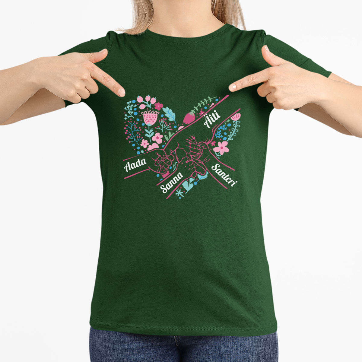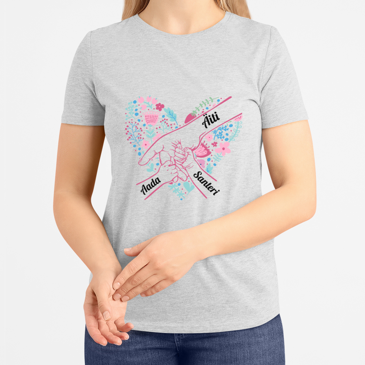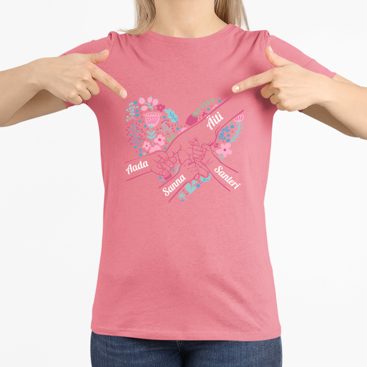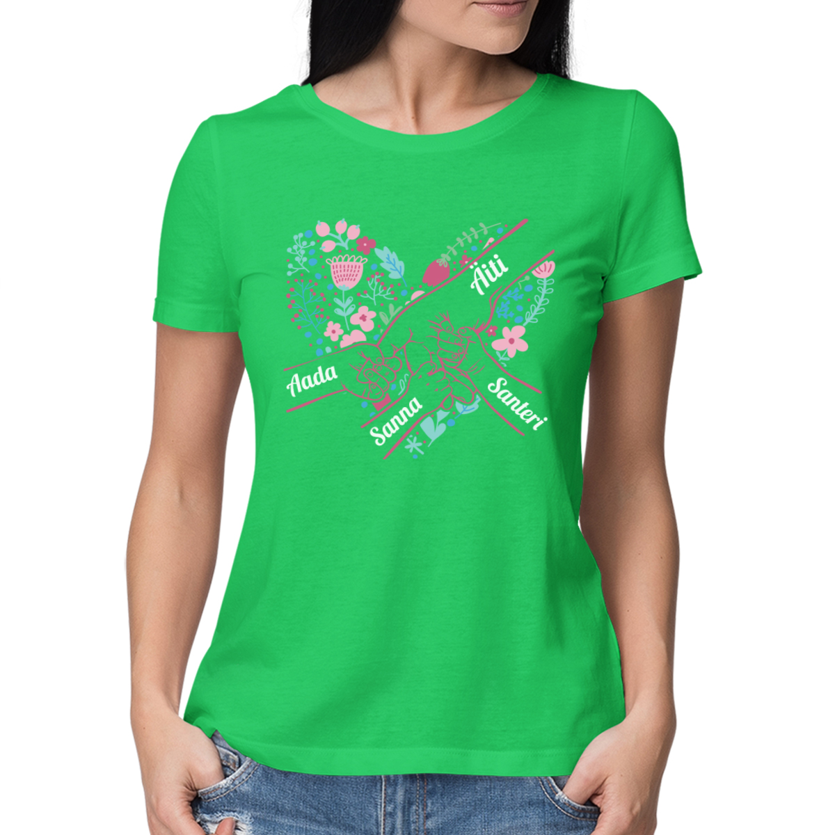 Naisten t-paita "Äidin sydän" valituilla lasten nimillä