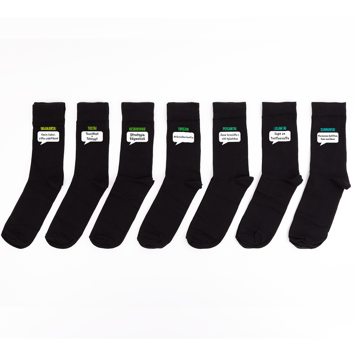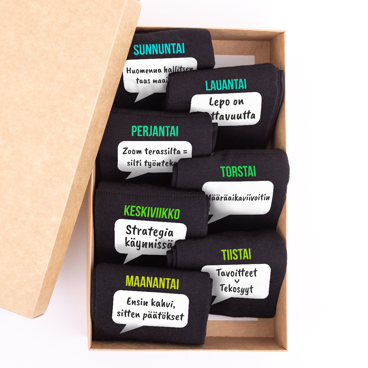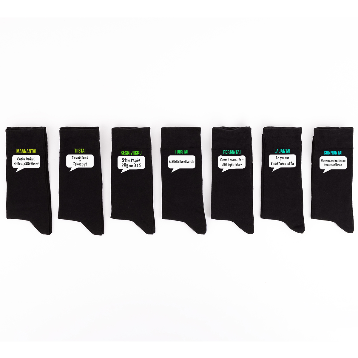 - 7 paria sukkia, joissa jokaisessa sukassa on painatus (7 eri asettelua x 2 kpl).